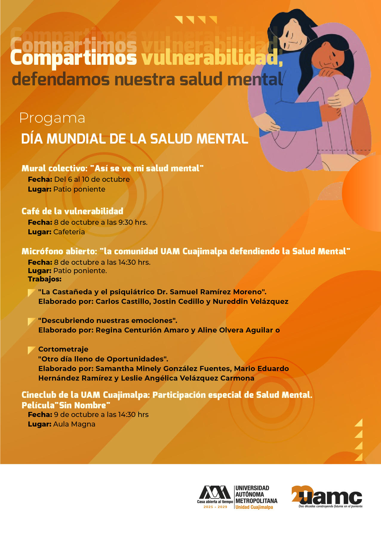 Te animamos a plasmar tu vivencia en el Mural Colectivo: "Así se ve mi Salud Mental", que estará disponible del 6 al 10 de octubre a partir de las 10 am, mediante frases o dibujos, como un acto de reconocimiento y unión.