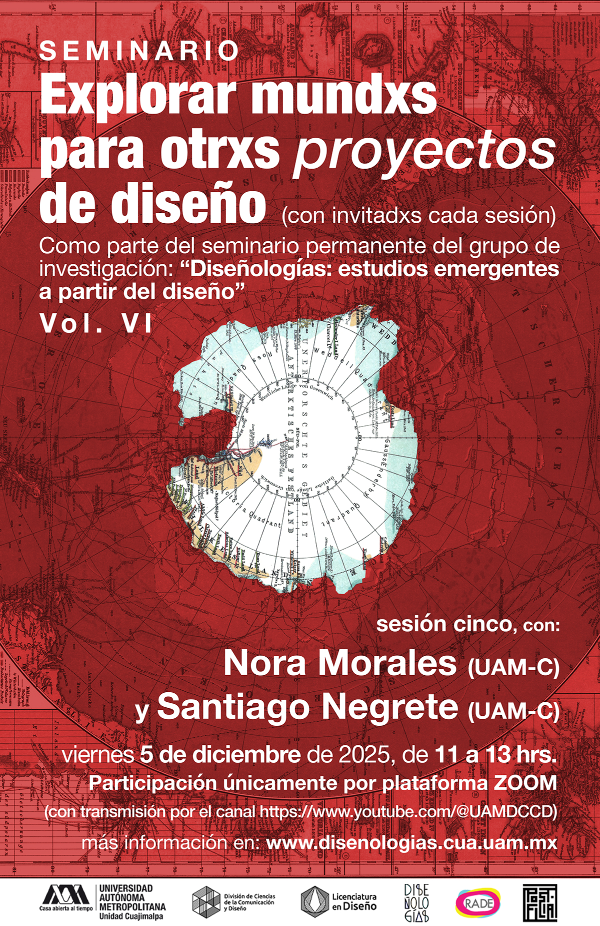 A nombre del grupo de investigación **"Diseñologías: estudios emergentes a partir del diseño"**, solicitamos apoyo para la difusión a la **sesión cinco** de su seminario, con los invitados **Nora Morales** (UAM-C) y **Santiago Negrete** (UAM-C).