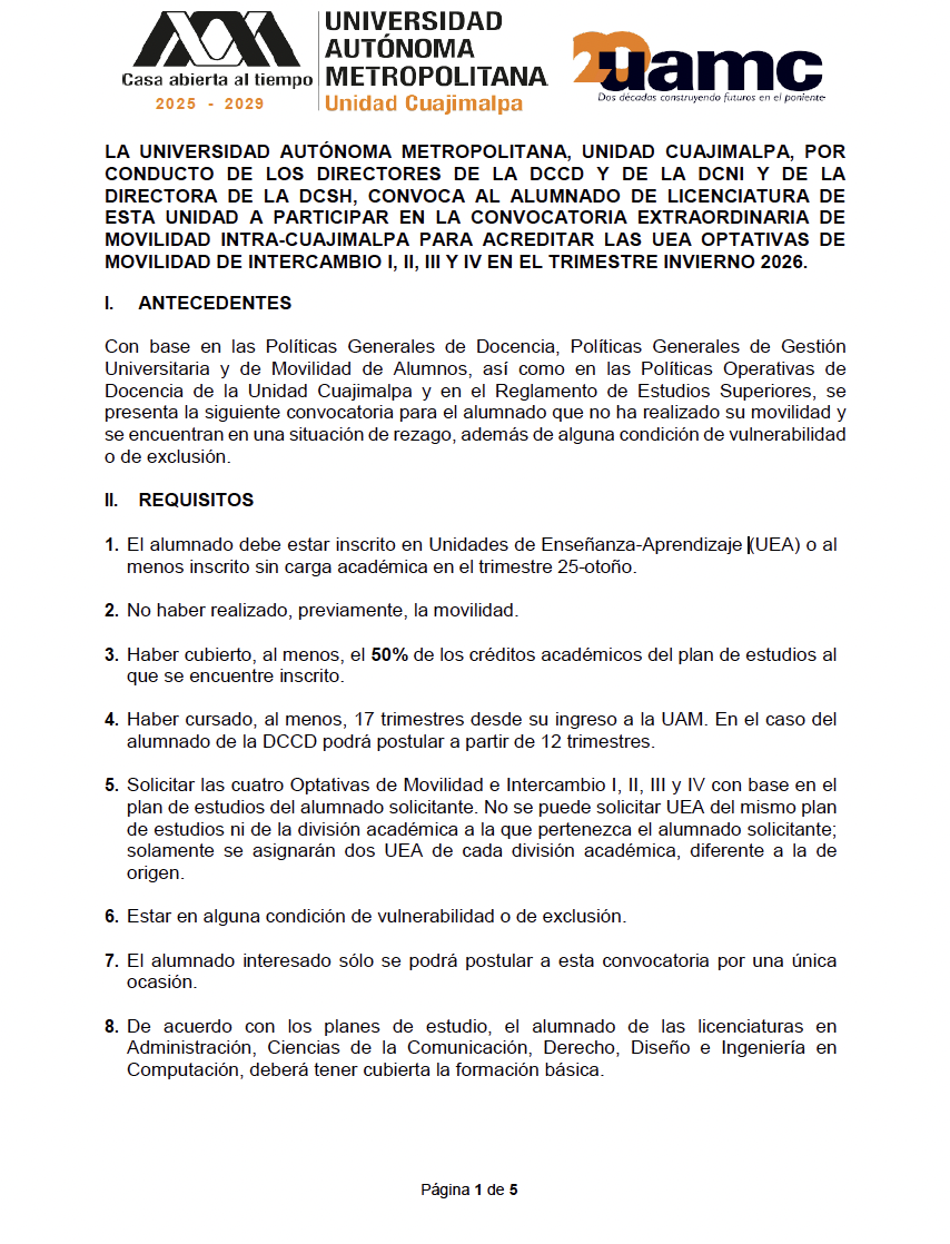 CONVOCATORIA DE MOVILIDAD INTRA UNIDAD CUAJIMALPA INVIERNO 2026